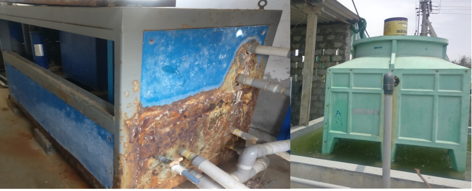 *Mostly made of MS and may rust, it uses Higher power usage. *Cooling towers has fan, fins, needs more power to run & rust-able. *Only fresh water can be used for cooling Tower.